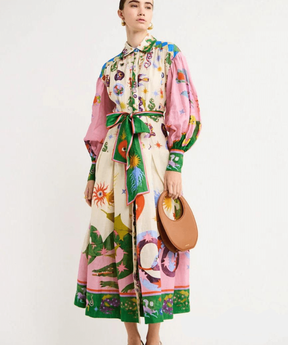 Confectionnée à partir du meilleur dacron léger, cette robe est une toile de créativité vivante, ornée d'illustrations de style peint à la main représentant des créatures mythiques, des corps célestes et des motifs vibrants. Chaque détail, des manches fluides à la jupe ample, célèbre la vie et l'art, faisant d'Aura non seulement une robe, mais une déclaration de style et de flair personnels.